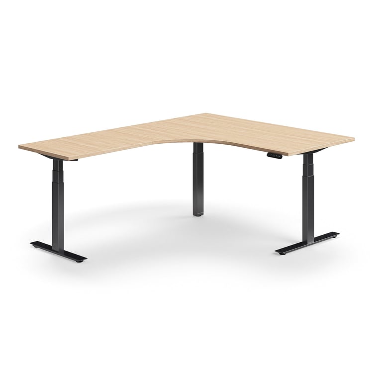 Biurko z regulacją wysokości QBUS, kształt L, 1600×2000 mm, czarna rama, dąb