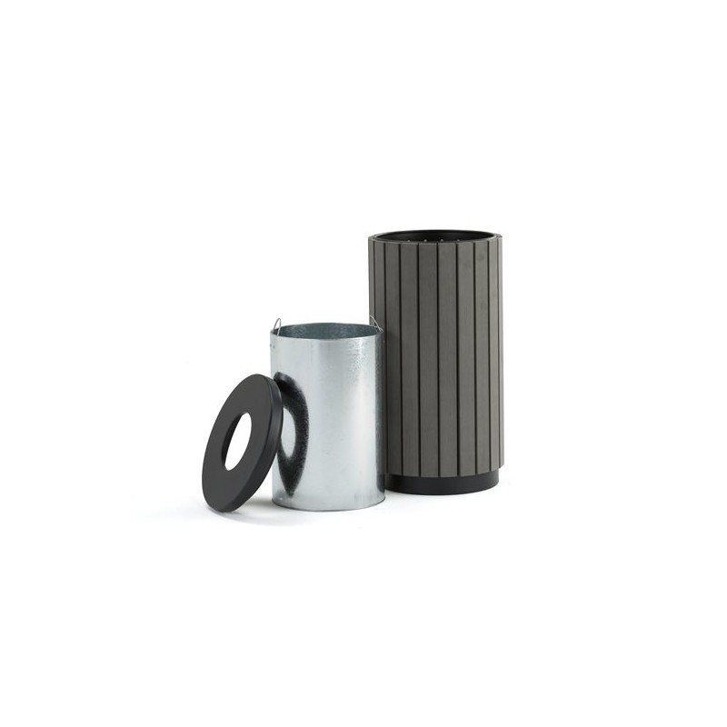 Klasyczny pojemnik do użytku na zewnątrz budynków. Wykonany z tworzywa aintwood, które wygląda jak drewno. Tworzywo aintwood jest odporne na złe warunki pogodowe oraz wilgoć. Praktycznie nie wymaga pielęgnacji. Część górna oraz dno kosza został wykonano z lakierowanej blachy stalowej. Kosz posiada wyjmowany galwanizowany pojemnik wewnętrzny, co ułatwia opróżnianie. Dwa modele do wyboru. Jeden model otwierany jest od góry. Drugi z dostępnych modeli posiada otwór wrzutowy z części bocznej oraz wbudowaną popielnicę, która dba, by niedopałki nie lądowały na ziemi. Polecamy ustawienie kosza z popielnicą pod zadaszeniem, aby zabezpieczyć produkty przed deszczem i śniegiem.