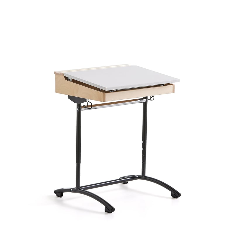 Biurko szkolne z pokrywą wyposażoną w membranę tłumiącą dźwięk, która przyczynia się do stworzenia przyjemnego otoczenia akustycznego. Pokrywa jest nachylona pod kątem około 5°. Można go unieść na płasko, korzystając ze wspornika znajdującego się wewnątrz. Biurko posiada mechanizm regulacji wysokości i jest wyposażone w dwa haczyki. Klasyczne biurko szkolne z powłoką z laminatu wysokociśnieniowego pochłaniającą dźwięk na pokrywie, zapewniającą lepsze warunki akustyczne w klasie.
