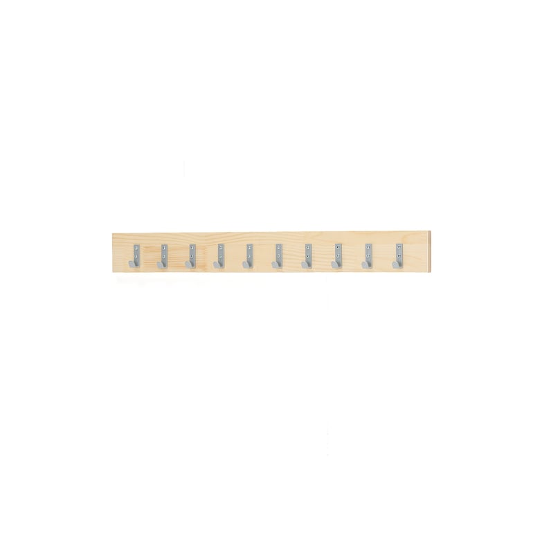 Listwa z 10 srebrnymi haczykami. Listwa z haczykami to bardzo praktyczny i oszczędny sposób na przechowywanie odzieży w szatniach, klasach, na korytarzach itp. Pomaga uzyskać dobrą organizację w przebieralniach. Model HÄNGA posiada 10 srebrnych haczyków i oferuje mnóstwo miejsca na torby, szaliki, kaski itp. Prosty design sprawia, że łatwo wkomponować produkt w otoczenie. Listwa HÄNGA jest wykonana z laminatu, co czyni ją trwałą i odporną na uszkodzenia.