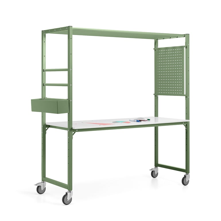 Wielofunkcyjny stół na kołach — idealny do projektów, spotkań itp. Blat stołu można ustawić na czterech różnych wysokościach i ma on powierzchnię do pisania jak tablica suchościeralna. W zestawie znajduje się praktyczny panel narzędziowy i skrzynka na akcesoria do przechowywania materiałów biurowych itp. Wielofunkcyjny stół doskonale nadaje się do współpracy w środowiskach kreatywnych lub szkolnych. Wybierz wysokość stołu odpowiadającą Twoim potrzebom. Niezależnie od tego, jaką wysokość wybierzesz, przy stole można wygodnie siedzieć lub stać. Ponieważ stół jest wyposażony w koła, w razie potrzeby można go łatwo przesunąć.