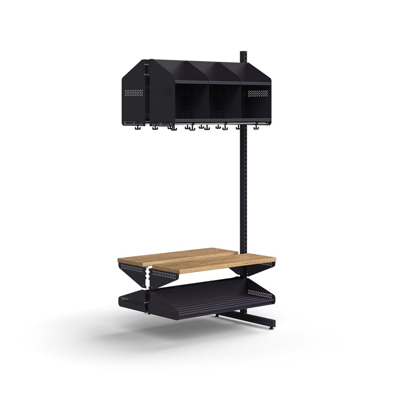 Moduł dodatkowy stojaka ENTRY na obuwie i nakrycia głowy. W komplecie z górną półką, półką z przegrodami, ławką i stojakiem na buty, ociekaczem, stelażem w kształcie T i stężeniem krzyżowym. Moduł dodatkowy można dodać wyłącznie do podłogowego modułu podstawowego. ENTRY to funkcjonalna seria do szatni z możliwością rozbudowy, w której każdą część można dostosować do potrzeb. Rozbuduj moduł podstawowy o ten stojak na nakrycia głowy i obuwie, aby stworzyć miejsce do przechowywania, które dobrze komponuje się z otoczeniem. Idealny wybór do szkolnej lub przedszkolnej szatni!