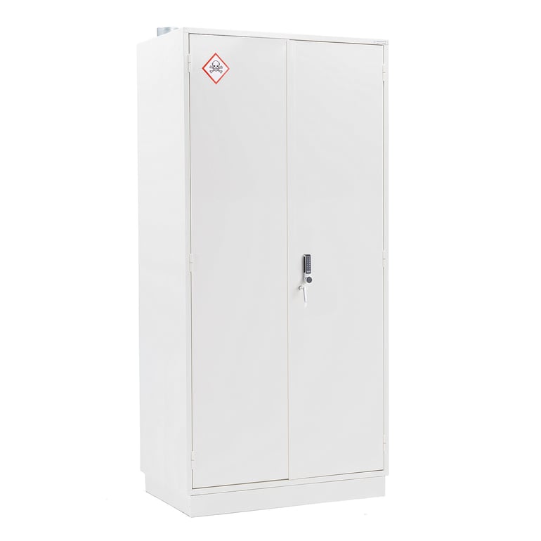 Zamykana szafa do przechowywania chemikaliów z izolacją przeciwogniową między dwiema płytami stalowymi w drzwiach (tzw. drzwi dwuścianowe), oraz w ramie, dnie oraz górnej części korpusu. Pokryta ognioodporną powłoką proszkową. Wyposażona w kanał wentylacyjny, wyjmowaną przednią podstawę oraz półki z podniesionymi krawędziami i uszczelnionymi narożnikami. Ta zamykana szafa na chemikalia została przetestowana pod kątem wentylacji. Szafa została wyposażona w kanał wentylacyjny wzdłuż lewego narożnika, z regulowanymi otworami wentylacyjnymi u góry i u dołu. Pomiędzy nimi znajdują się mniejsze punkty wyciągowe, które zapewniają wentylację przestrzeni między wszystkimi półkami.