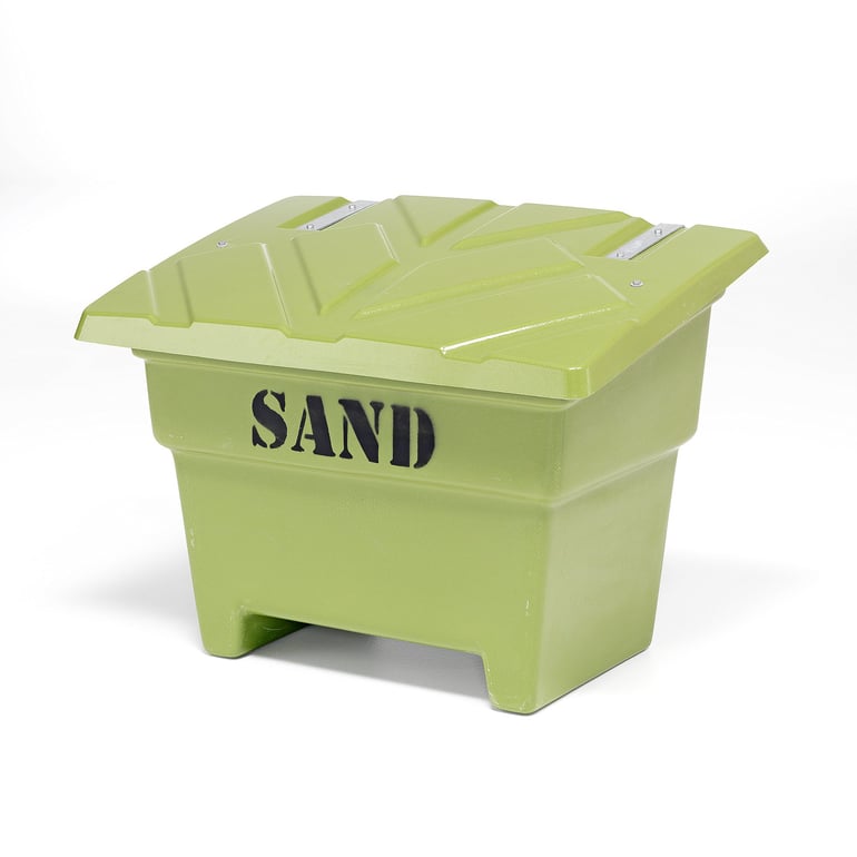 Sztaplowany pojemnik na sól i piach, niezbędne podczas zimy. Falista pokrywa zapewnia pojemnikowi trwałość i stabilność. Nóżki umożliwiają transport przy pomocy wózka widłowego. Wysokiej jakości pojemniki na piach wykonane z włókna szklanego. Posiadają bezpieczne, zaokrąglone krawędzie. Pojemniki są niezwykle trwałe i odporne na niekorzystne warunki pogodowe. Można sztaplować, co ułatwia transport i magazynowanie. Pojemniki na piach i sól doskonale sprawdzają się w okolicy parkingów, na dworcach i innych miejscach publicznych, gdzie posypuje się nawierzchnię w trakcie zimy. Pojemniki są dostępne w różnych kolorach i rozmiarach. Wybierz rozmiar dostosowany do potrzeb Twojego biznesu!