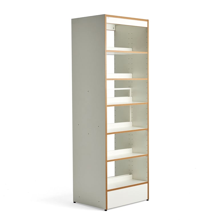 Regał do biblioteki oferuje prosty skandynawski design, z białą ramą z laminatu HPL i dębowymi krawędziami. Półki wykonane są z blachy i wyposażone w zagięte krawędzie. Pozwala to na przechylenie półek i wykorzystanie ich do prezentowania tytułów książek lub przechowywania gazet i czasopism.