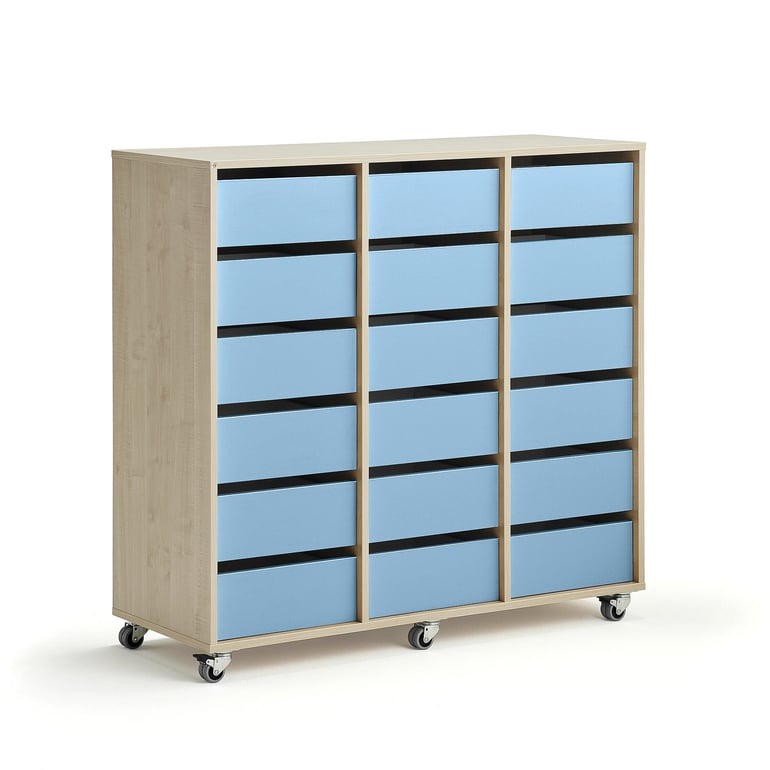 Mobilny mebel szkolny do przechowywania papieru, długopisów, książek i innych materiałów szkolnych. Mebel oferuje szuflady, które pomieszczą papier w formacie A4. Wykonany z wytrzymałego laminatu i wyposażony w koła z blokadą. Mobilny regał służy jako doskonały mebel do przechowywania rzeczy osobistych uczniów w salach lekcyjnych. Jego kompaktowa i pojemna konstrukcja umożliwia przechowywanie wielu rzeczy na niewielkiej powierzchni. Przydziel uczniom własną szufladę do przechowywania papieru, ołówków, książek i nie tylko.