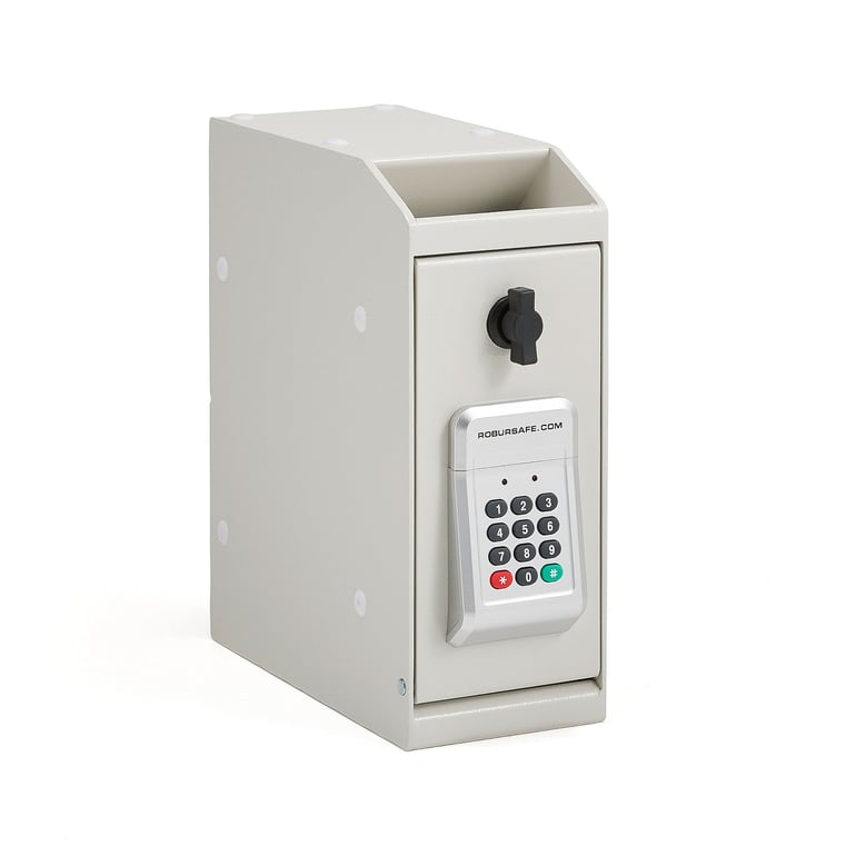 Skrytka na banknoty z dodatkowo zabezpieczonym wrzutem na banknoty oraz pojemnikiem wewnętrznym. Wyposażona w zamek na kod lub zamek na klucz. Przetrzymuj gotówkę, czeki oraz karty kredytowe bezpiecznie podczas godzin pracy w wąskiej, oszczędzającej miejsce skrytce na banknoty. Skrytka jest łatwa w obsłudze i w ustawieniu. Perfekcyjne do zamontowania pod ladą sklepową.