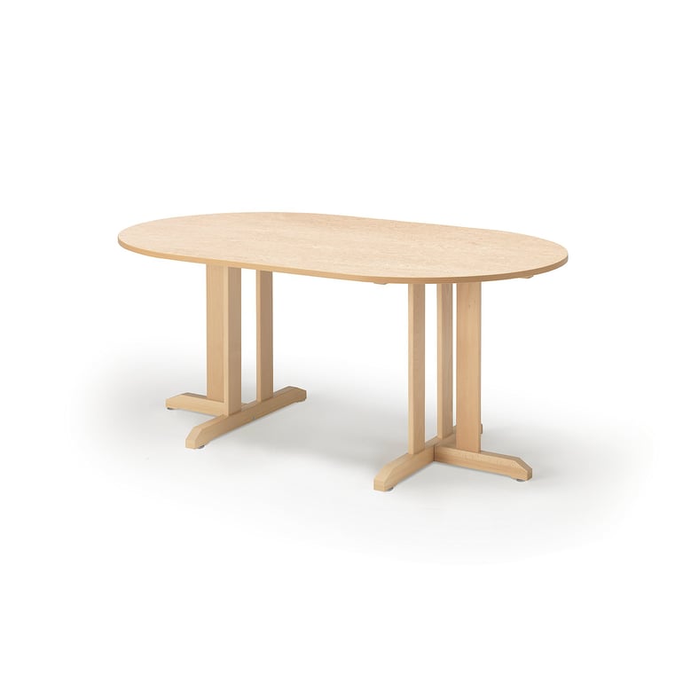 Stół z solidną podstawą z drewna brzozowego, zaokrąglonymi narożnikami i blatem wykonanym z tłumiącego hałas, przyjaznego dla środowiska linoleum. Stół KUPOL jest stabilny i wytrzymały z podstawą wykonaną z brzozy. Blat nie ma ostrych narożników ani krawędzi dla bezpiecznego użytkowania, dzięki czemu to najlepszy wybór do przedszkoli, szkół, stołówek oraz innych środowisk w których obecne są dzieci. Konstrukcja podstawy ułatwia czyszczenie pod stołem i zapewnia dużo miejsca aby wygodnie usiąść przy stole.