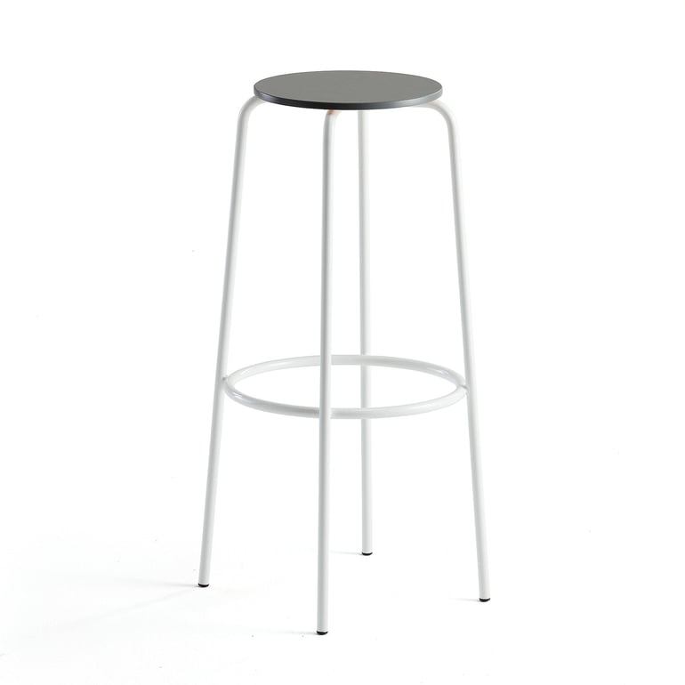 Smukły stołek barowy z ramą z rur stalowych i wytrzymałym siedziskiem. Klasyczny i stylowy stołek barowy do restauracji, barów, hoteli, pubów itp. Stołek barowy z rur stalowych lakierowanych proszkowo na kolor biały. Siedzisko wykonane z laminatu wysokociśnieniowego HPL. Stołek jest trwały i łatwy do wyczyszczenia. Prosty stołek o ponadczasowym designie z podnóżkiem. Zapewnia komfort siedzenia i podparcie dla nóg i stóp.