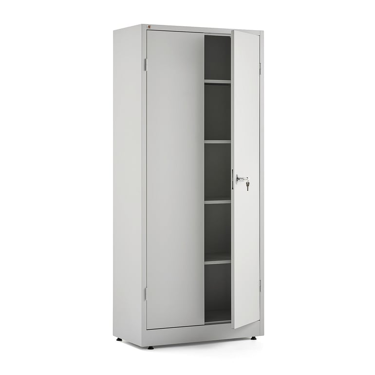 Zarówno korpus, jak i drzwi zostały pomalowane na dyskretny odcień szarości. W komplecie znajdują się regulowane stopki, umożliwiające wypoziomowanie szafy na nierównym podłożu. Produkt posiada pięć półek, z których jedna stanowi cokół. Pozostałe cztery półki regulowane w odstępach 50 mm, co pozwala stworzyć system przechowywania dostosowany do potrzeb. Każda półka wytrzymuje maksymalne równomierne obciążenie 50 kg. Dodatkowe półki dostępne jako akcesoria.
