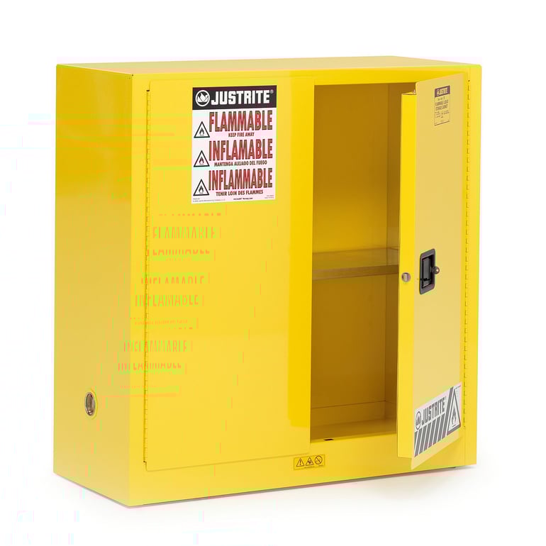 Szafa bezpiecznego przechowywania z atestem FM. Na substancje łatwopalne. Mechanizm samodomykający na wypadek pożaru. Zawiera bezpieczny zamek 3-punktowy z 2 kluczami i tacę zbierającą wycieki. Chroń pracowników i zmniejsz ryzyko pożaru, umieszczając łatwopalne ciecze oraz chemikalia w zamykanej szafie bezpiecznego przechowywania. Szafa jest ognioodporna i posiada atest FM. Podwójne ściany z grubych, spawanych arkuszy blachy stalowej. Izolacja przeciwogniowa 38 mm. Mechanizm samodomykający drzwi w razie pożaru. Drzwi wyposażone w bezpieczny zamek 3-punktowy. Można zamontować dodatkową kłódkę. Szafa wyposażona w regulowane półki, odblaskowe nalepki ostrzegawcze i ograniczniki płomieni z 2 złączami rurowymi. Taca o wys. 51 mm skutecznie zbiera wycieki.