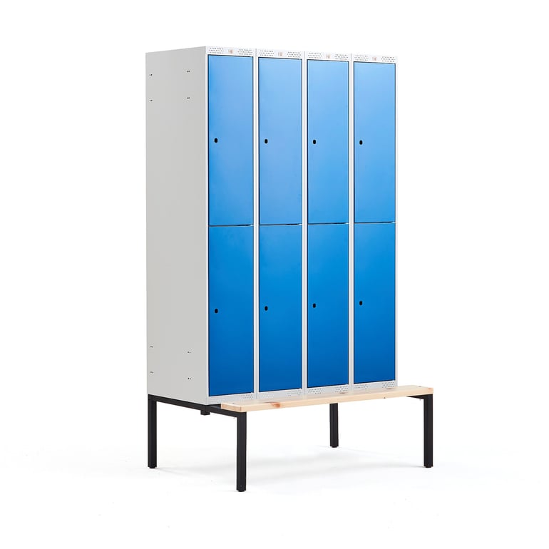 Szafa schowkowa CLASSIC, 2 schowki w pionie, z ławeczką, 4 moduły, 2120x1200x550 mm, niebieski