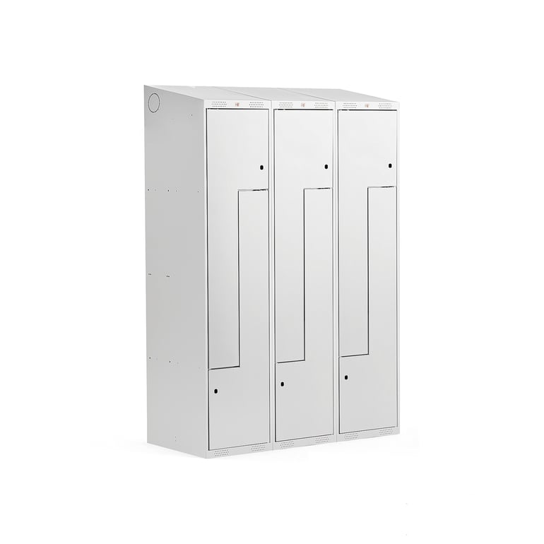 Szafa na ubrania ze skośnym daszkiem, składająca się z dwóch części po dwie przegrody w każdej. Każdy schowek posiada zabezpieczenie przed szerokim otwarciem, haczyk oraz wentylację. Szafę można dostosować, dodając różnego typu podstawy. Szafy dostarczamy bez zamków. Szafy typu L to doskonałe rozwiązanie do ciasnych pomieszczeń. Stanowią świetną alternatywę do pomieszczeń, w których nie ma wystarczająco dużo miejsca na szafy z pojedynczymi drzwiami, oferując równie dobre rozwiązanie. Nasze szafy stalowe są stabilne i niezwykle wytrzymałe. Sprawdzą się w różnych przestrzeniach i są szczególnie polecane do szkół oraz szatni. Każdy schowek zapewnia miejsce na rzeczy osobiste, takie jak odzież, torby i kaski.