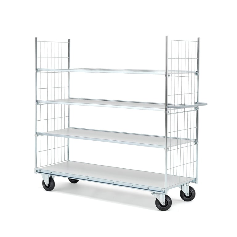Wszechstronny wózek z podwoziem z galwanizowanej stali. Wózek posiada dwie wysokie ramy z siatki i cztery półki, w tym trzy z regulacją wysokości. Wygodny uchwyt na jednym z boków ułatwia manewrowanie wózkiem. Funkcjonalny wózek z półkami. Niezwykle mocny i wytrzymały. Wytrzymałe koła sprawdzą się idealnie przy ciężkim załadunku i ułatwią sterowanie wózkiem. Dwa koła stałe oraz dwa samonastawne. Koła zapewniają stabilny transport. Ramy wykonane z rur stalowych o grubości 22 mm i siatki z drutu stalowego. Jedna rama z uchwytem dla łatwiejszego sterowania. Cztery szersze półki zapewniają mnóstwo miejsca na załadunek. Półki o grubości 12 mm pokryte zostały wytrzymałym, białym laminatem. Dolna półka montowana na stałe. Pozostałe trzy półki z regulacją wysokości, co ułatwia dostosowanie wózka do rozmiaru ładunku. Maks. równomierne obciążenie 300 kg. Zawartość utrzymywana jest na miejscu dzięki ramom i podwyższonym krawędziom półek.
