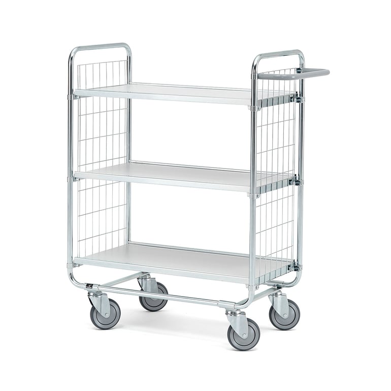 Łatwy w manewrowaniu wózek półkowy z rur stalowych. Dwie ramy z siatki stalowej i trzy półki z laminatu z bezstopniową regulacją wysokości. Wyposażony w wygodny uchwyt i cztery lekko toczące się koła. Funkcjonalny wózek z półkami. Niezwykle mocny i wytrzymały. Wózek posiada wytrzymałą stalową konstrukcję. Wysokie ramy wykonano ze stalowej rury o grubości 22 mm i siatki z drutu. Jedna z ram posiada szeroki uchwyt zapewniający łatwe sterowanie i mobilność. Trzy półki o grubości 12 mm pokryte zostały wytrzymałym białym laminatem. Regulacja wysokości półek. Ułatwia to dostosowanie wysokości wózka do rozmiaru ładunku. Maks. równomierne obciążenie 200 kg. Zawartość utrzymywana jest na miejscu dzięki ramom i podwyższonym krawędziom półek. Przystosowany do przewozu plastikowych skrzynek. Wyposażony w cztery kółka samonastawne.
