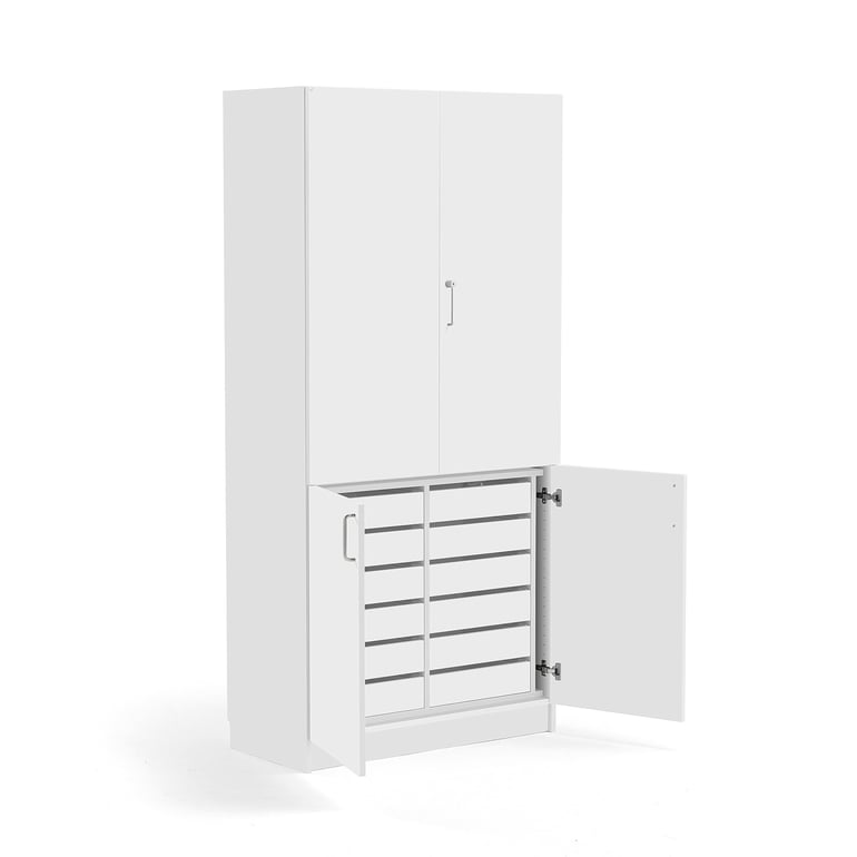 Szafa z podwójnymi drzwiami. Górna część jest zamykana i wyposażona w przestawne półki. W dolnej części znajdują się szuflady. Szafa do przechowywania posiada wytrzymałe powierzchnie. Wysoka szafa do dyskretnego przechowywania materiałów rzemieślniczych, stolarki, tekstyliów itp.