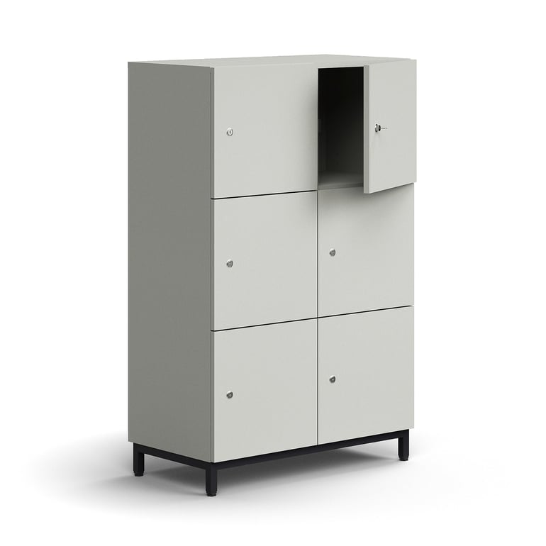 Ta praktyczna szafa składa się z sześciu oddzielnych, zamykanych przegród i jest idealna do przechowywania na przykład rzeczy osobistych lub artykułów biurowych.