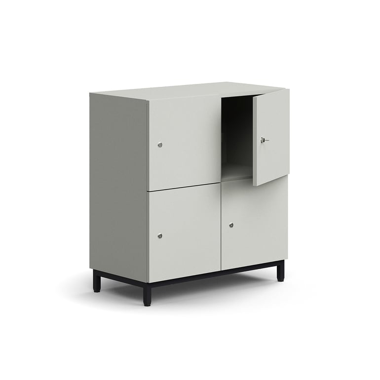 Ta praktyczna szafa do przechowywania składa się z czterech oddzielnych, zamykanych przegród i jest idealna do przechowywania na przykład rzeczy osobistych lub artykułów biurowych.