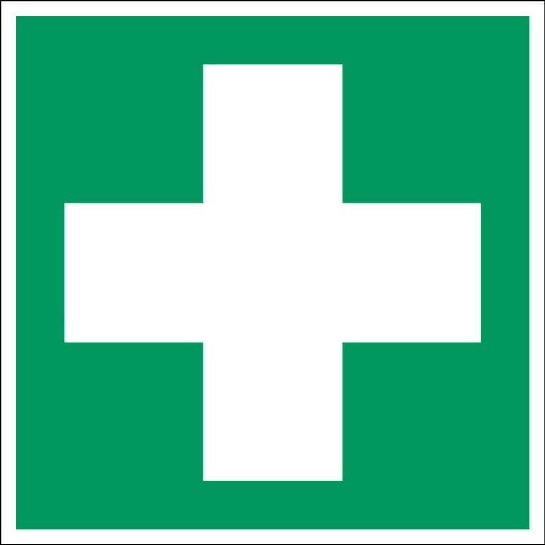 Oznaczenie z symbolem sprzętu i apteczki pierwszej pomocy, zgodne z normą EN ISO 7010.